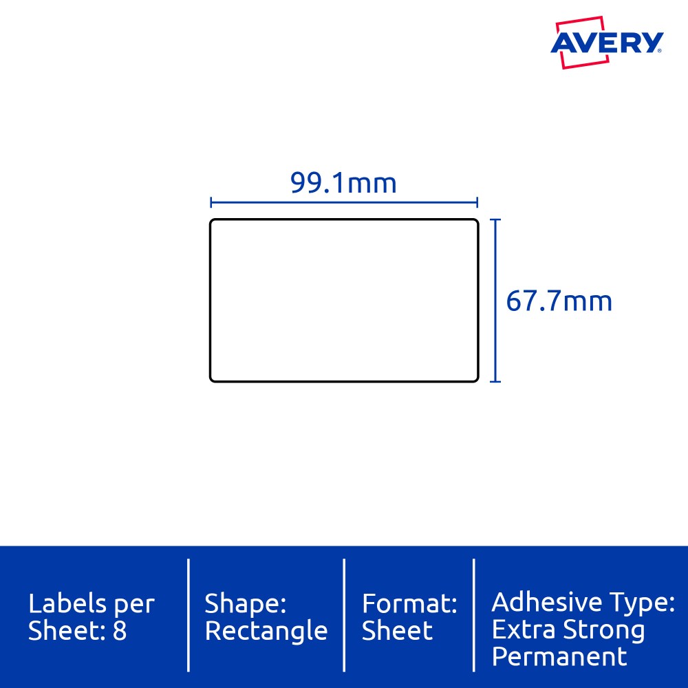 • Size: 99.1x67.7mm 80 labels, 10 sheets. 8 labels per sheet (8UP).