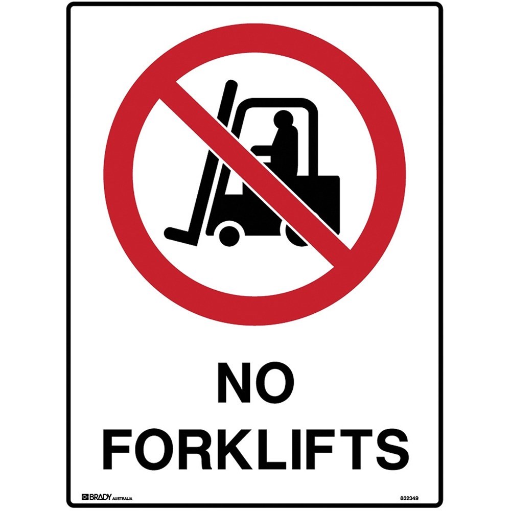 Brady Prohibition Sign No Forklifts 450W x 600mmH Metal White/Red/Black
