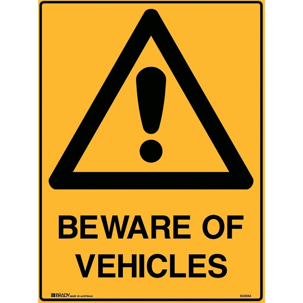 Brady Warning Sign Beware Of Vehicles 450W x 600mmH Polypropylene Yellow And Black