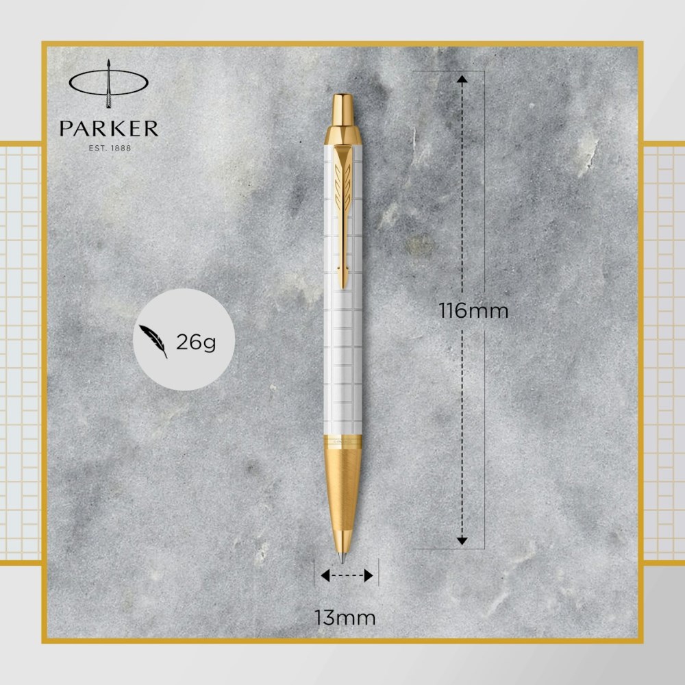 • Elegant pearl lacquered body engraved with a modern asymmetric square pattern is complemented by gold trims and the signature Parker arrow clip.
