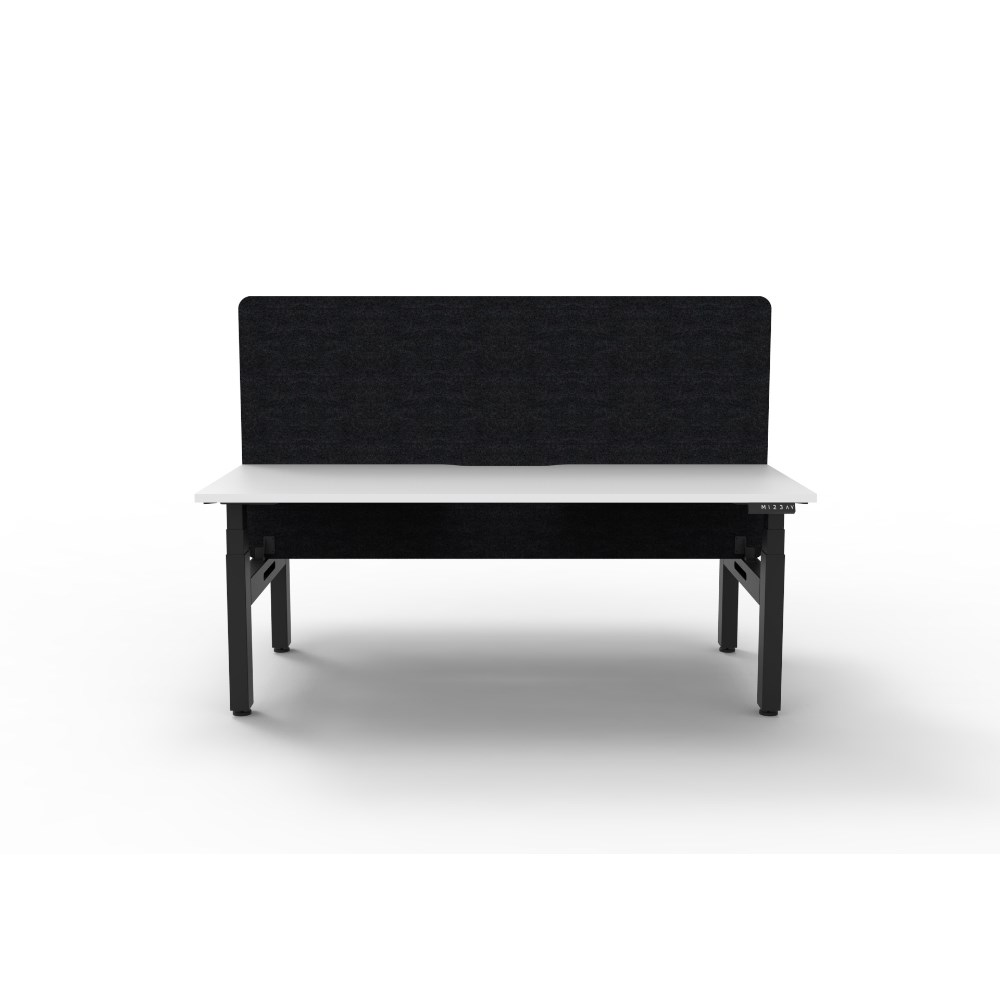 • Natural White worksurface with rigid edging and 50mm scallop cable cut out. E0 rated 25mm top. Black Satin powder coat underframe. Eco screen.