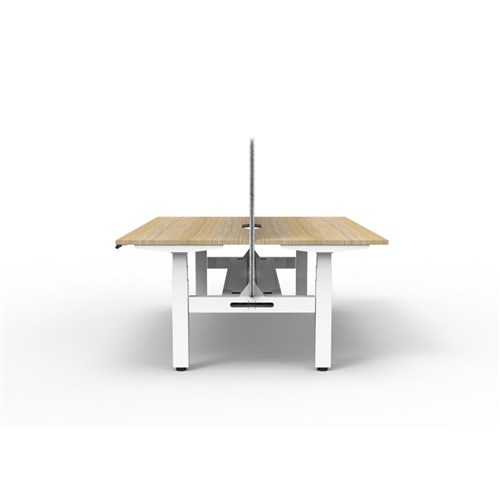 • Natural oak worksurface with rigid edging and 50mm scallop cable cut out. E0 rated 25mm top. White satin powder coat underframe. Eco screen and cable tray.