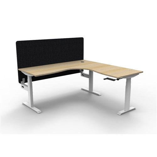 • Manual crank height adjustable corner workstation with Natural Oak top and White Satin frame, Black Eco screen.