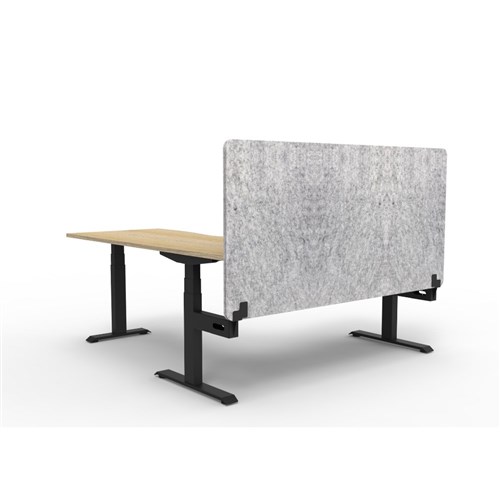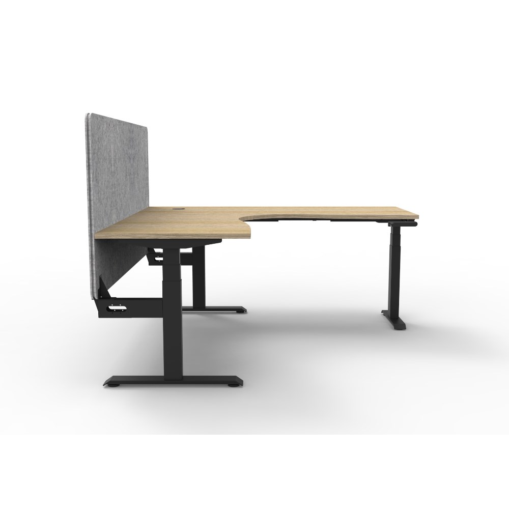 • Manual crank height adjustable corner workstation with Natural Oak top and Black Satin frame, Grey Eco screen.