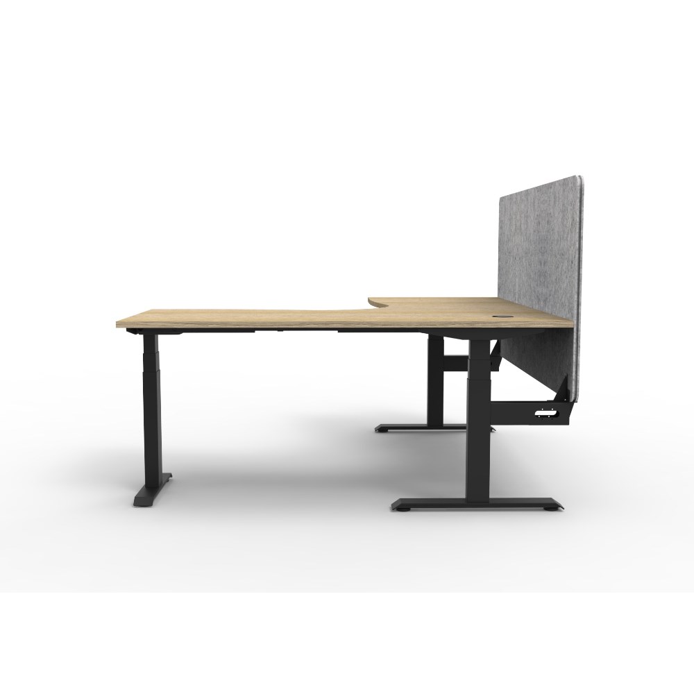 • Manual crank height adjustable corner workstation with Natural Oak top and Black Satin frame, Grey Eco screen.