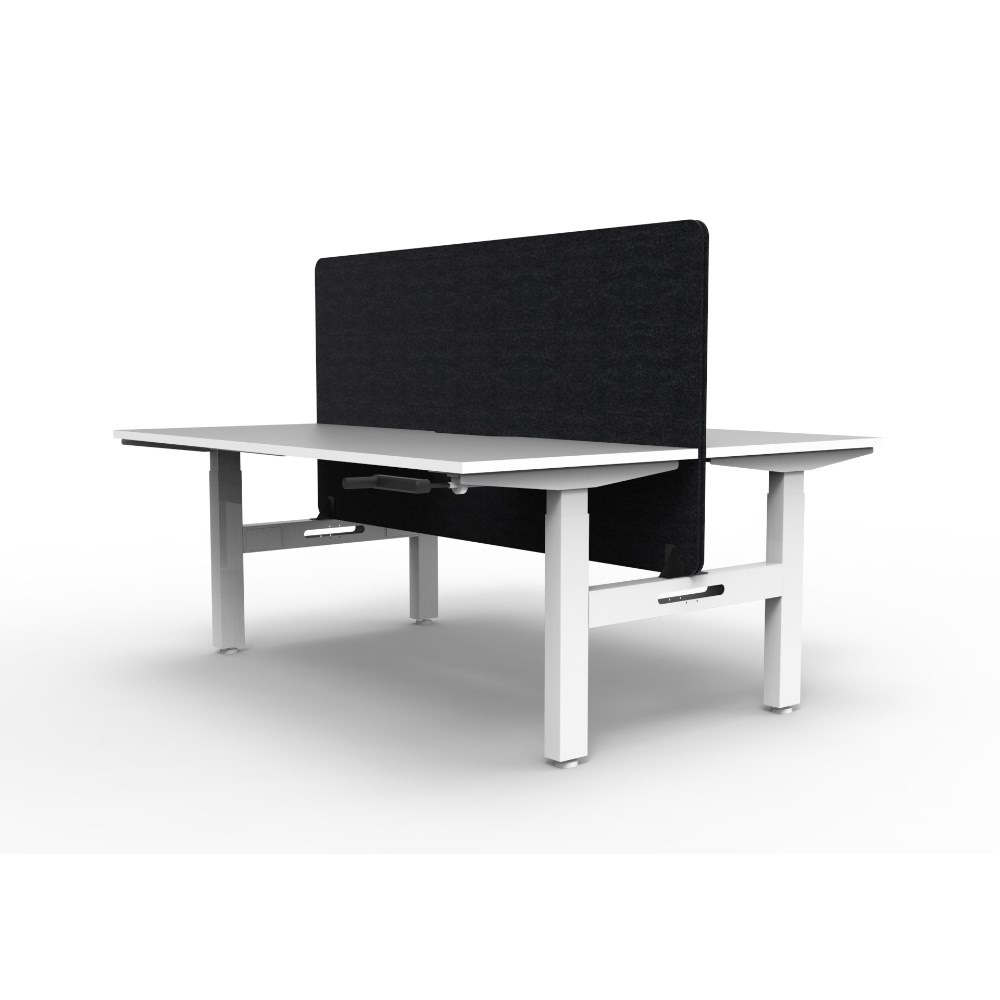 • Manual crank height adjustable 2 person back to back workstation with Natural White top and White Satin frame, Black Eco screen.
