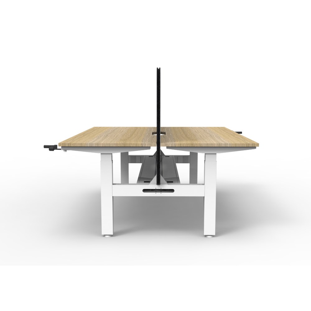 • Manual crank height adjustable 2 person back to back workstation with Natural Oak top and White Satin frame, Black Eco screen and cable tray.