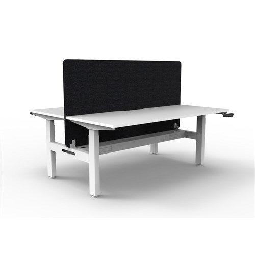 • Manual crank height adjustable 2 person back to back workstation with Natural White top and White Satin frame, Black Eco screen and cable tray.