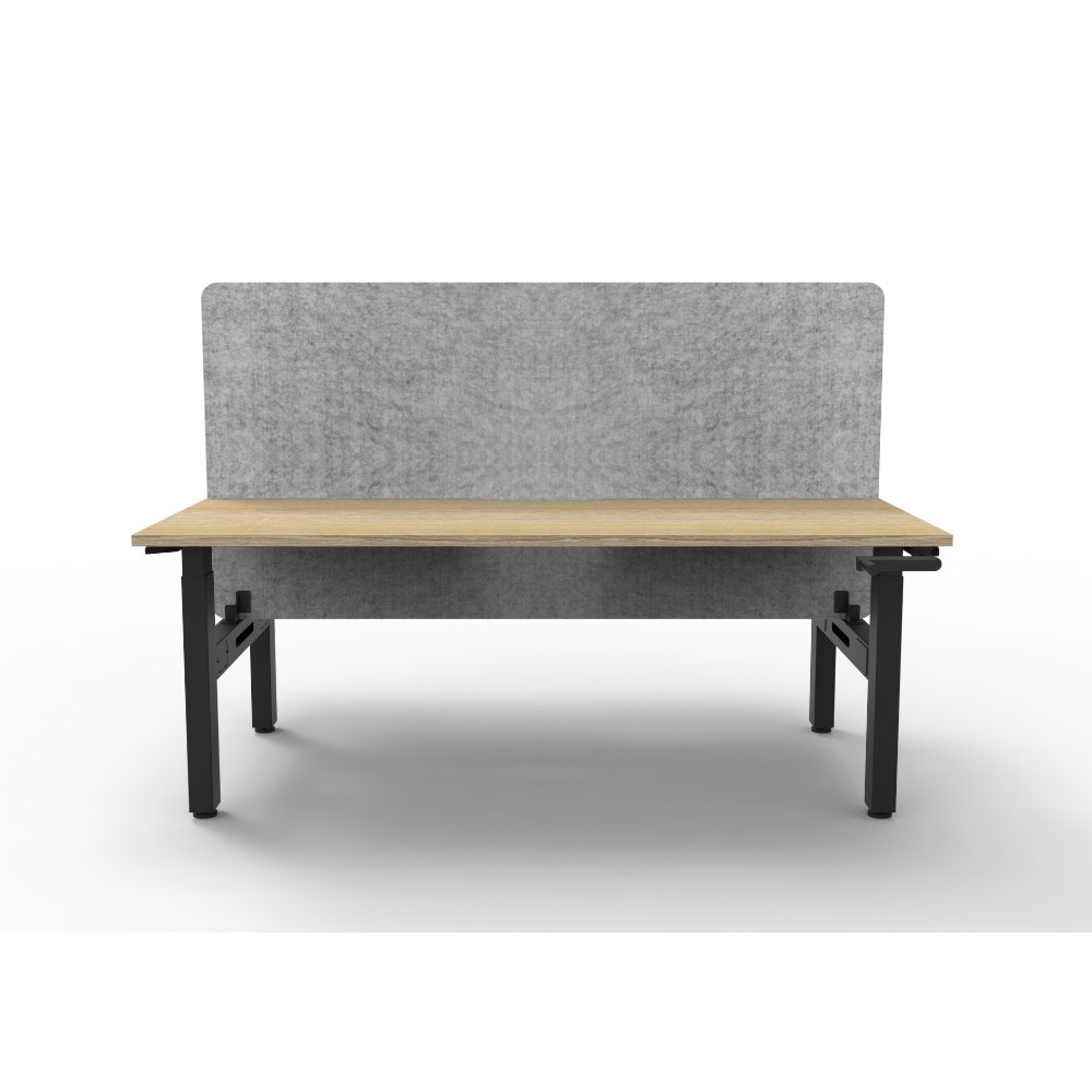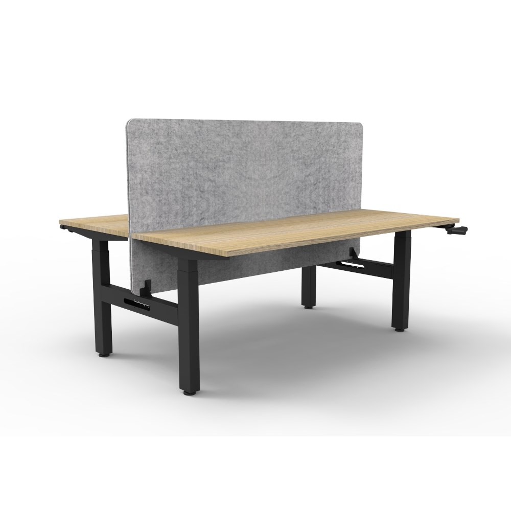 • Manual crank height adjustable 2 person back to back workstation with Natural Oak top and Black Satin frame, Grey Eco screen.