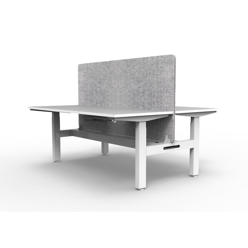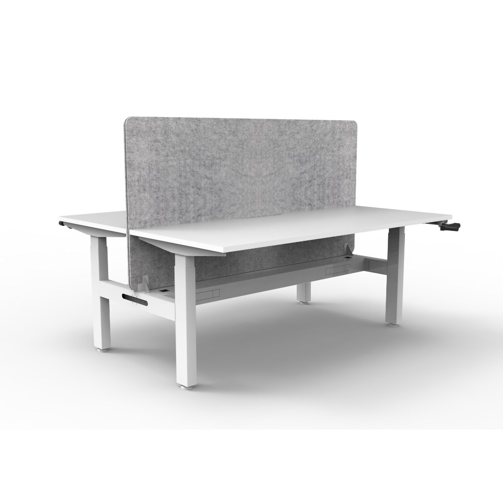 • Manual crank height adjustable 2 person back to back workstation with Natural White top and White Satin frame, Grey Eco screen and cable tray.