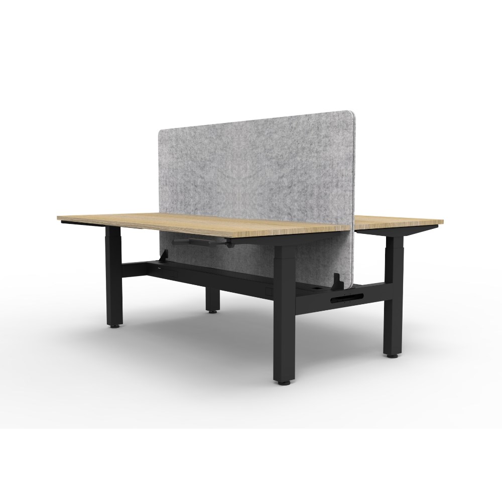 • Manual crank height adjustable 2 person back to back workstation with Natural Oak top and Black Satin frame, Grey Eco screen and cable tray.