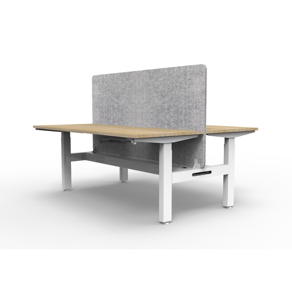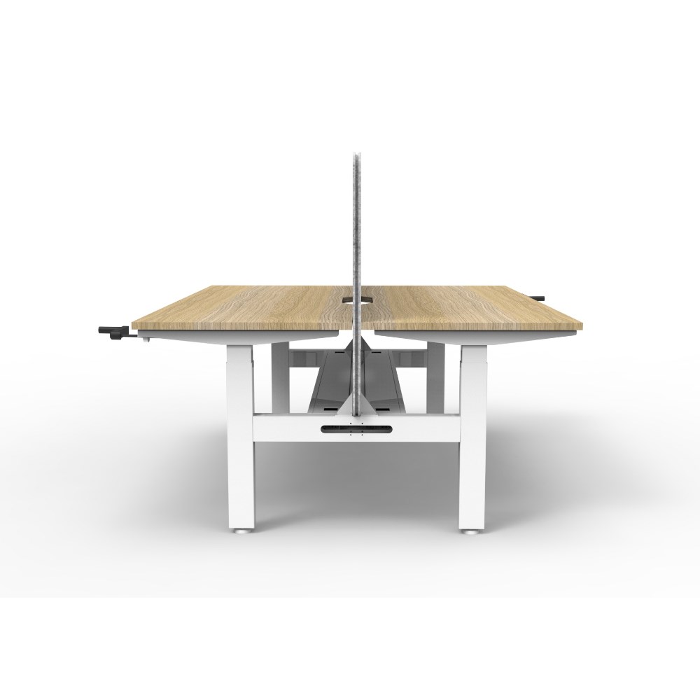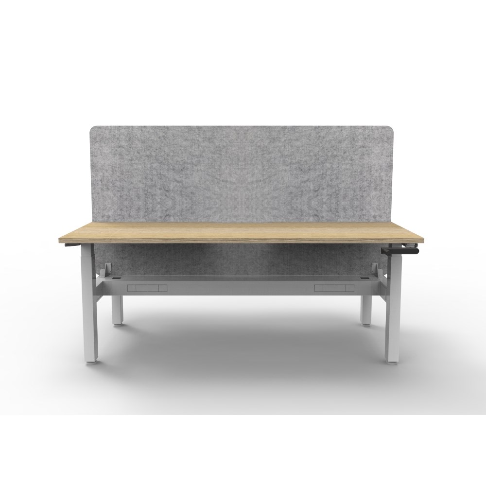 • Manual crank height adjustable 2 person back to back workstation with Natural Oak top and White Satin frame, Grey Eco screen and cable tray.