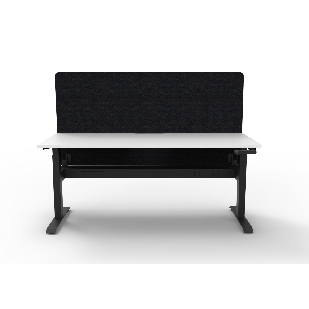 • Manual crank height adjustable single sided workstation with Natural White top and Black Satin frame, Black Eco screen and cable tray.