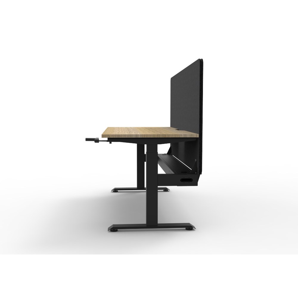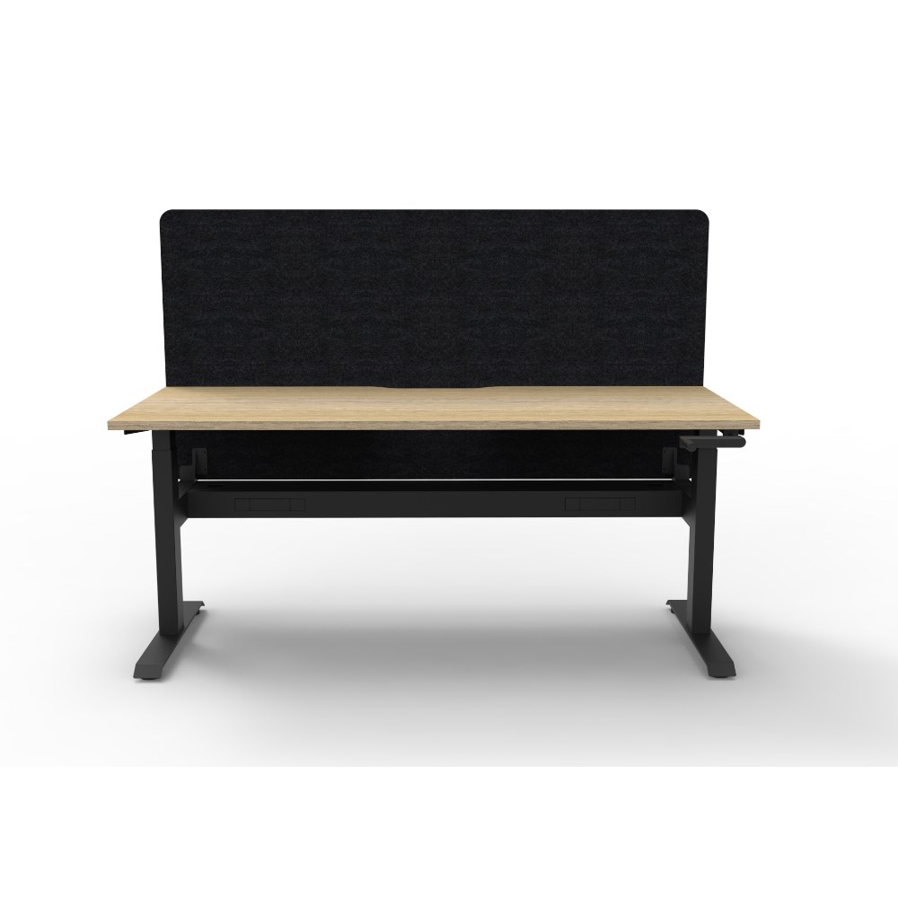 • Manual crank height adjustable single sided workstation with Natural Oak top and Black Satin frame, Black Eco screen and cable tray.