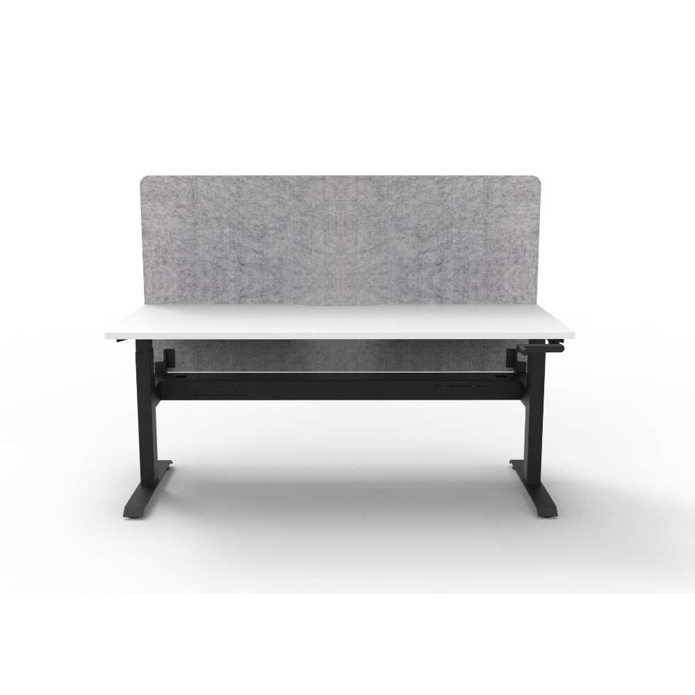 • Manual crank height adjustable single sided workstation with Natural White top and Black Satin frame, Grey Eco screen and cable tray.
