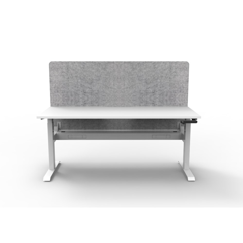 • Manual crank height adjustable single sided workstation with Natural White top and White Satin frame, Grey Eco screen and cable tray.