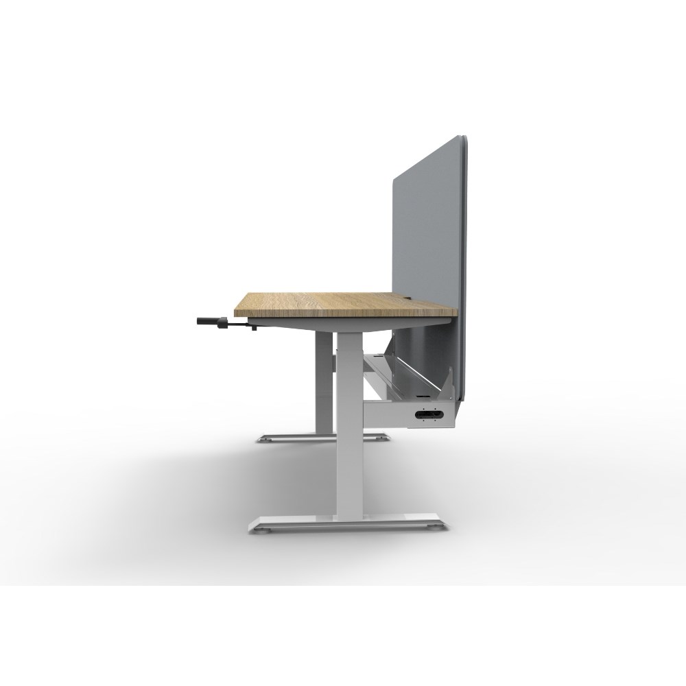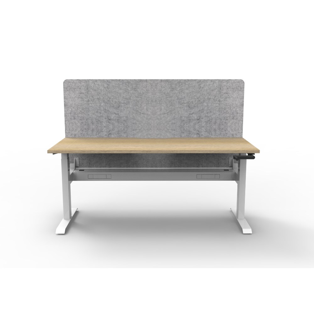 • Manual crank height adjustable single sided workstation with Natural Oak top and White Satin frame, Grey Eco screen and cable tray.