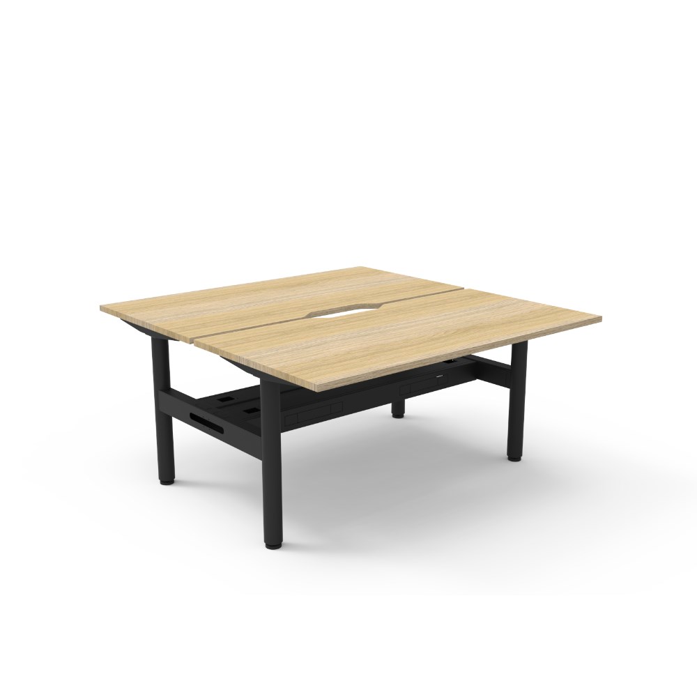• Natural Oak top Black Satin frame. Double sided workstation with cable tray.