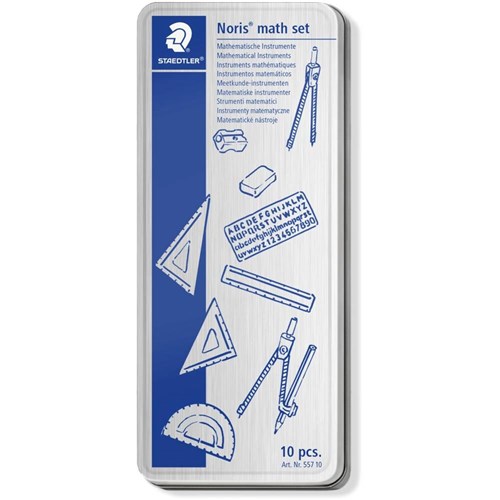 • Contains ruler, protractor, set squares, sharpener, eraser, pencil, compass, dividers and lettering guide.