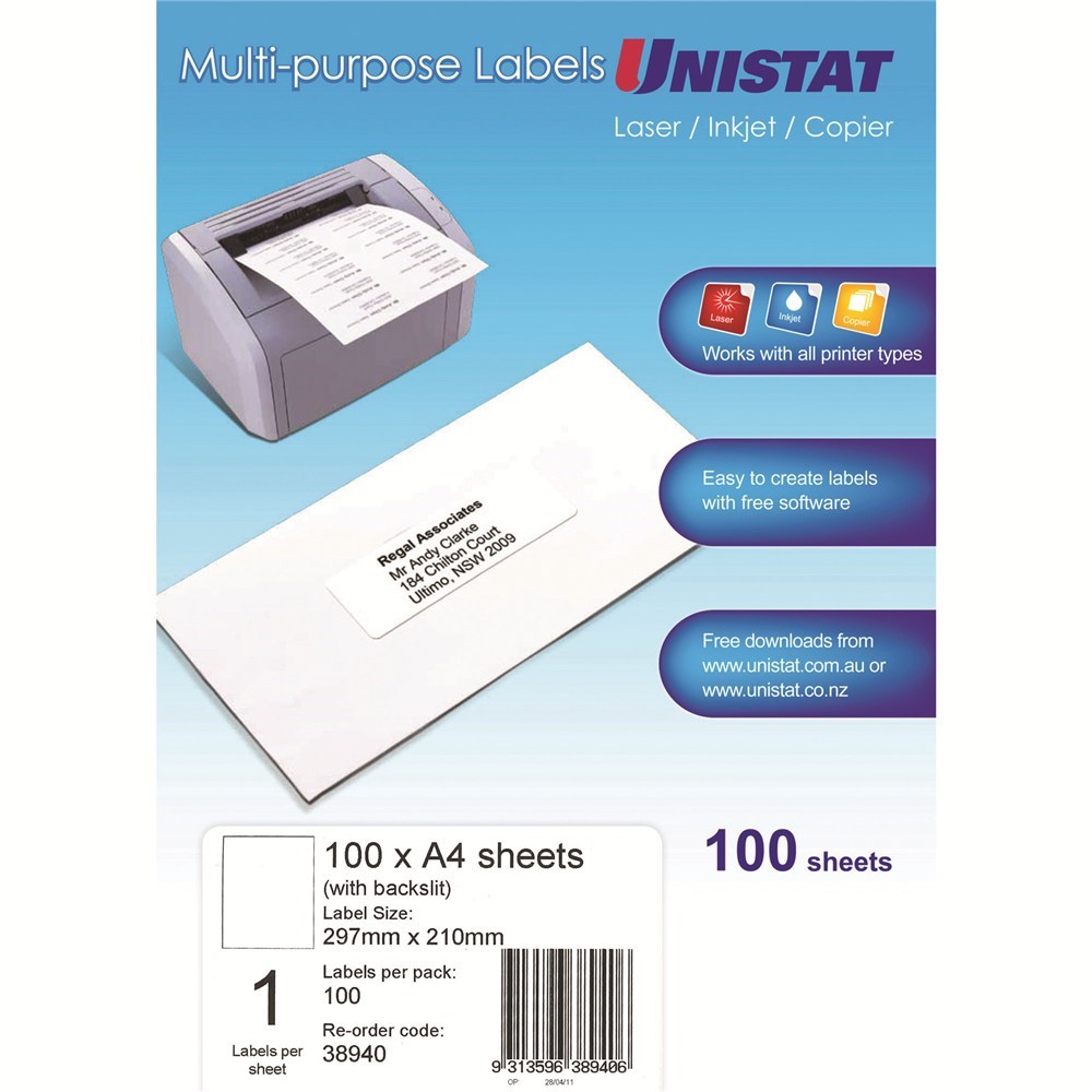 Unistat Laser Copier & Inkjet Labels 297x210mm Back Slit 1UP 100 Labels 100 Sheets